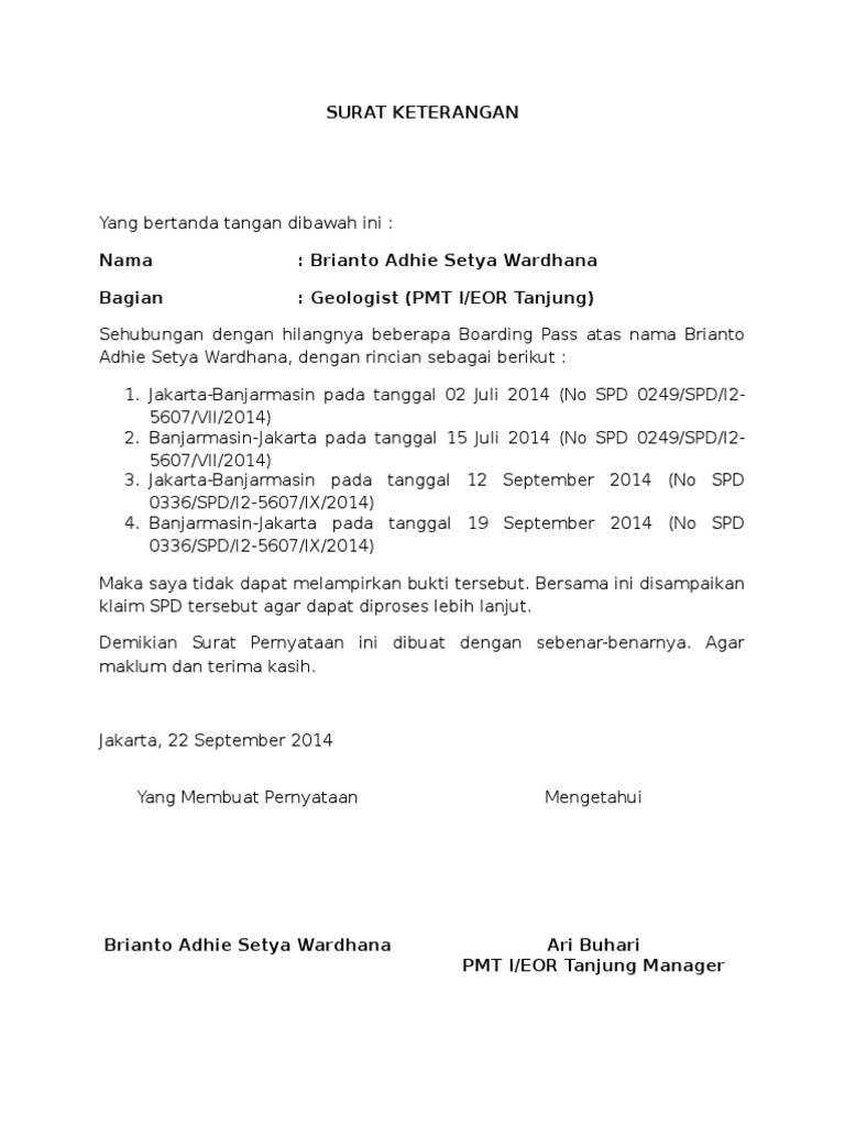 Gawe CV Agustus 31 2019 Contoh Surat. Geologist PMT IEOR Tanjung Sehubungan dengan hilangnya beberapa Boarding Pass atas nama Brianto Adhie Setya Wardhana dengan rincian sebagai berikut. Untuk Kelengkapan SPJ Saya Buat Surat Pernyataan Boarding Pass Tidak Bisa Dilampirkan.
